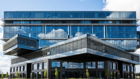 A low-angle view of a contemporary office building, showcasing its sleek design with horizontal louvers and large glass windows against a cloudy sky.