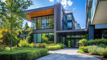 A serene modern courtyard featuring a clean walkway lined with lush greenery and trees. Glass buildings create a tranquil atmosphere ideal for relaxation.