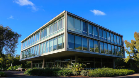 Discover a stunning office building from the 1960s featuring a geometric design. Highlighting clean lines and a harmonious blend with the environment.