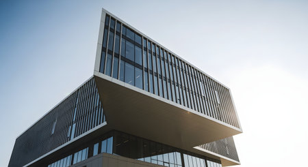 A dramatic low-angle photograph showcases a modern, minimalist office building with a striking, angular, cantilevered design against a clear blue sky. The facade's clean lines and pattern of glass and dark panels represent the height of contemporary corporate architecture and success.