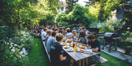 An outdoor gathering of individuals is shown at a long table. The scene depicts a casual, social atmosphere with people interacting. The composition features vibrant greenery, a picnic table, and a grill. This image can be used for editorial content or promotional material related to social events.