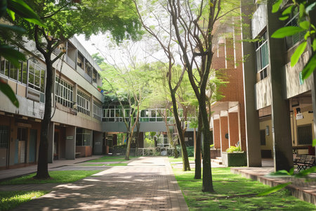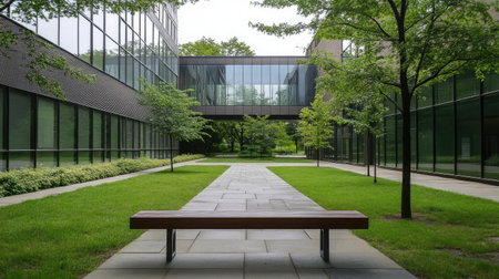 A serene modern courtyard featuring a clean walkway lined with lush greenery and trees. Glass buildings create a tranquil atmosphere ideal for relaxation.