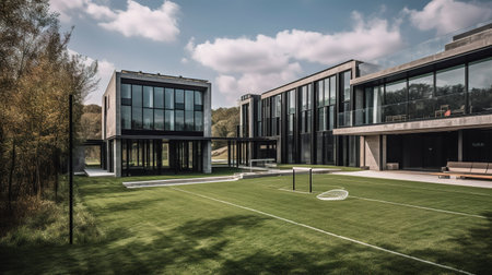 modern office building with green grass and soccer field in front of it