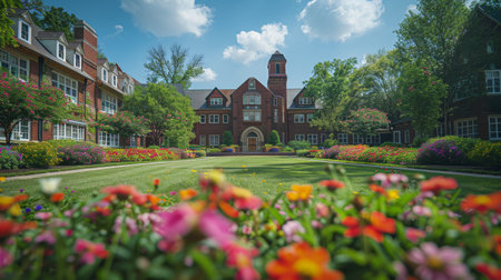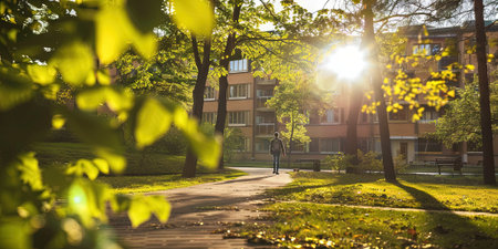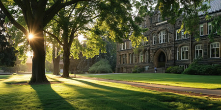 Captivating autumn view of an old university campus bathed in sunlight. The scene showcases colorful leaves and peaceful surroundings, perfect for reflection.