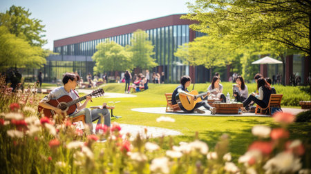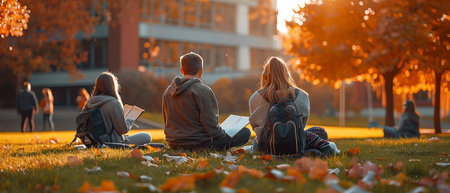 A tranquil scene unfolds on a college campus as students immerse themselves in their studies during the vibrant autumn season. Surrounded by the golden hues of falling leaves, they find inspiration in their academic pursuits, epitomizing the essence of youthful curiosity and the pursuit of knowledge.