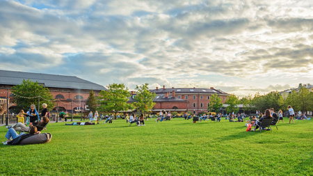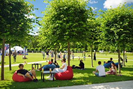 St. Petersburg, Russia - August 16, 2021: People relaxing in the summer recreation area on New Holland Island on the green lawn