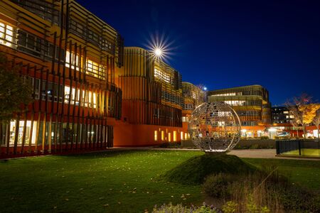 VIENNA, AUSTRIA - OCTOBER, 2019: Globe sculpture and orange buildings of University of Economics in Vienna