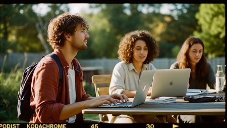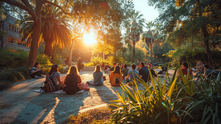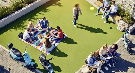 Young professionals gather outdoors for a collaborative study and business meeting on a sunny day