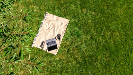 Laptop computer and headphones on park green grass, working and studying online outdoors, work outside office concept, aerial drone view from above