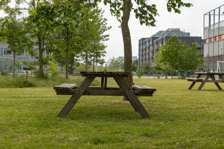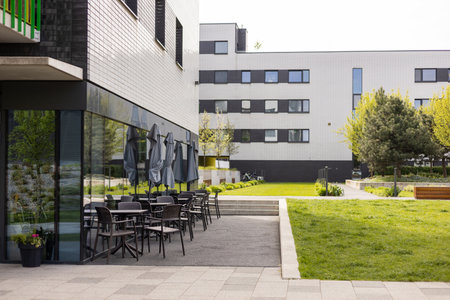 Modern outdoor terrace with seating arrangement. Fashionable outdoor cafe or restaurant tables, summer time