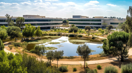 Modern office building with garden and lake. Panoramic view.
