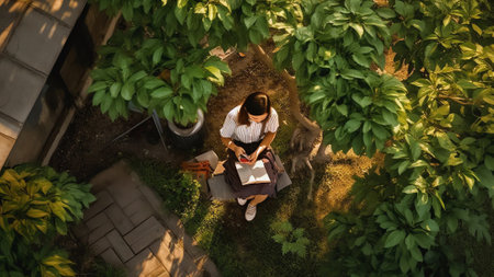 Generative AI : Aerial view of a woman playing with a cat in Pietragalla Potenza Basilicata Italy