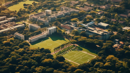 An overhead shot capturing a park in the city, showcasing a variety of trees and buildings, An aerial view of a sprawling university campus, AI Generated