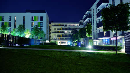 Warsaw, Poland. 7 August 2020. Artistic Zoliborz. Modern apartment buildings at night. This is a unique place. Functional, smartly designed. This is an aesthetic space with good energy.