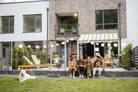 Group of young friends spending summertime together, having fun sitting together with drinks and guitar on a porch of the country house, wide view on a beautiful cottages