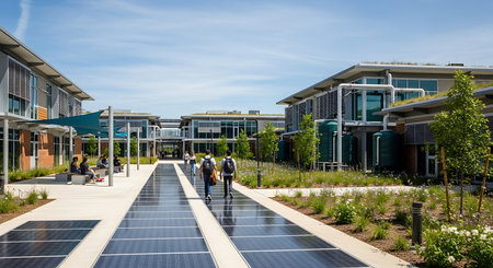 A view of a contemporary corporate campus featuring sustainable architecture, lush landscaping, and innovative walkways made of solar panels with people walking by.