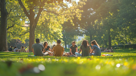 A group of young friends sitting together in a park on a sunny day