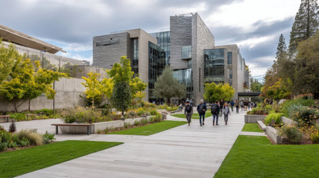 A contemporary university building with an urban design, surrounded by lush greenery and walkways. Students are seen walking between classes on a cloudy day, enjoying the campus atmosphere.
