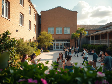 A group of diverse students are studying and relaxing outside a modern university building with laptops and books in hand, bathed in warm sunlight. They are engaged in sharing knowledge and campus experiences.