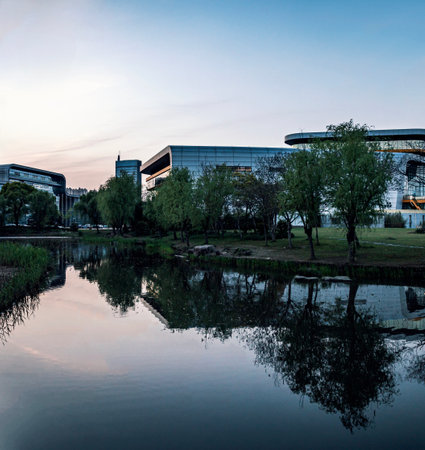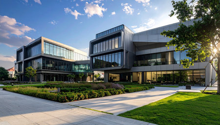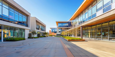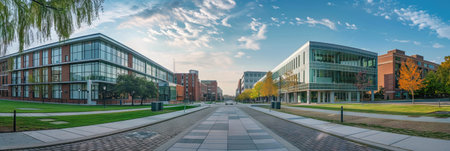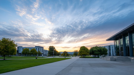 A serene campus walkway flanked by modern architecture and late autumn trees at dawn. the quiet scene features a blend of natural beauty and contemporary building design, creating a harmonious environment. Generative AI