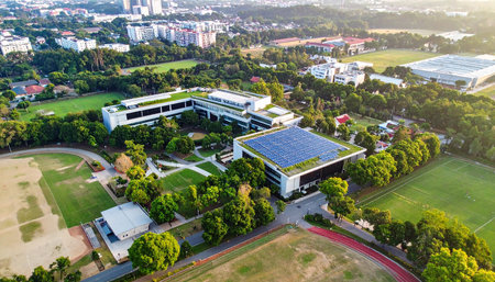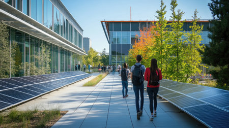 Solar panels on the roof of a modern university campus, with students walking nearby.