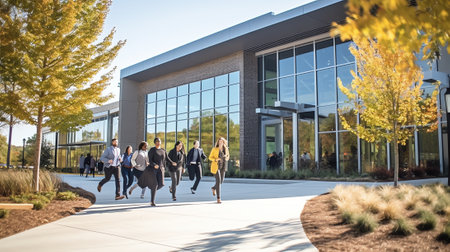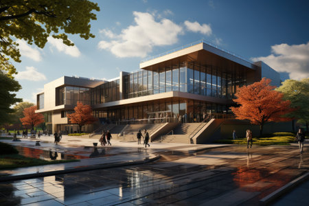 A group of students sits near a modern library during autumn, symbolizing education, learning, and the vibrant atmosphere of a university campus. The scene captures the collegiate spirit and the beauty of the fall season.