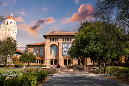 May 9, 2019 Palo Alto / CA / USA - Panoramic view of the Stanford Oval and the Main Quad