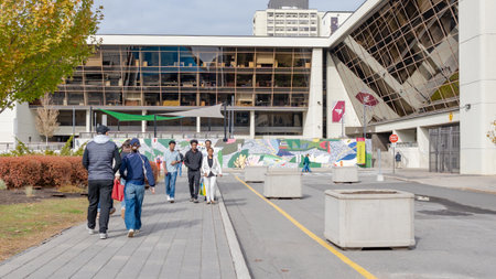Ottawa ON, Canada - October 25, 2025: Group of diverse students stroll along the pathway outside uOttawa University, highlighting modern architecture and colorful murals