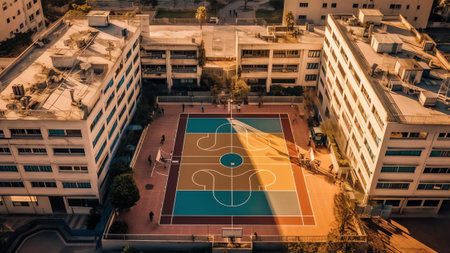 Generative AI : Aerial view of a small football field in a residential district of Mudanya a small town along the Marmara Sea coastline Bursa Turkey