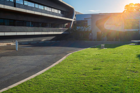 Adelaide, Australia - October 5, 2020: Glenunga International High School facade viewed from school yard at sunset