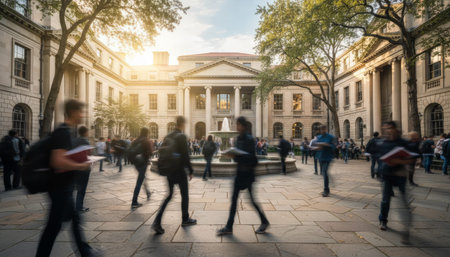 Diverse Students Moving Quickly Across Crowded Courtyard, Blur Of Motion And Focused Pace For Exams, Backpacks And Books In Hands, Tense But Determined Campus Energy Under Afternoon Light