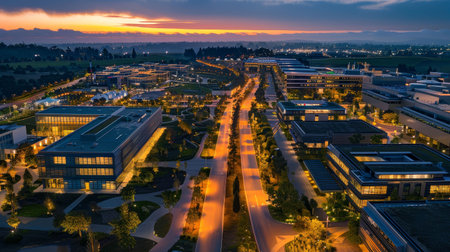 Aerial view of biotech industrial park at dusk, lights illuminating the path to innovation, future of healthcare ar 52