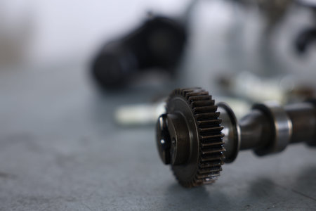 Camshaft gear of an internal combustion engine on blurred background of disassembled engine