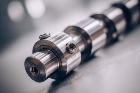 A detailed view highlighting the gleaming metallic surface and precise craftsmanship of an automotive camshaft, emphasizing its engineering complexity and polished finish.