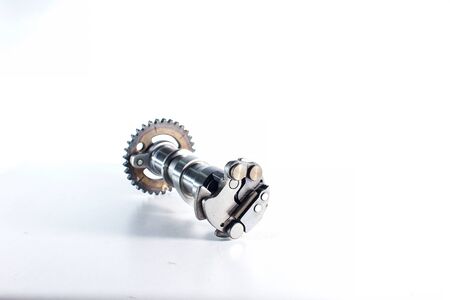 Camshaft from a small internal combustion engine. Accessories for repairing drive systems. Dark background.