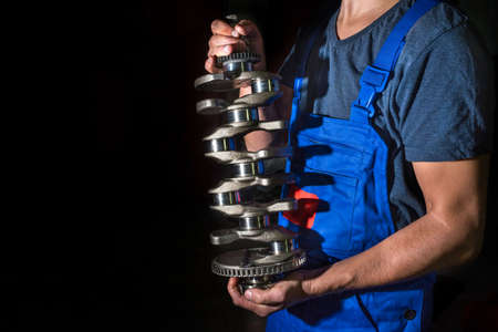 Auto mechanic with a crankshaft in his hands, on a black background. Auto engine repair services.