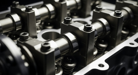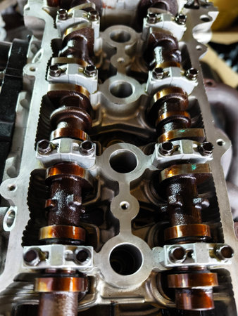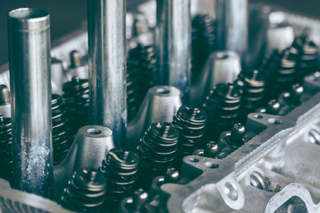 Detailed close up of a car engine cylinder head, revealing the intricate valve train, camshafts, and springs. precision engineering for automotive power.
