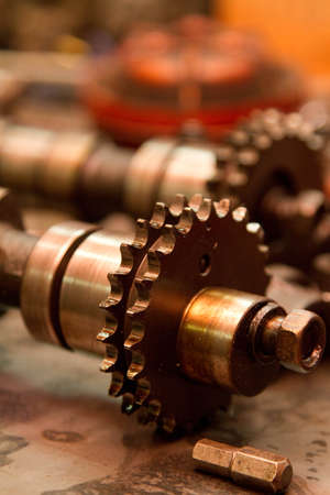 Two bearings with gears, parts from the vehicle on an iron table in the workshop. Repair concept. Moody style.