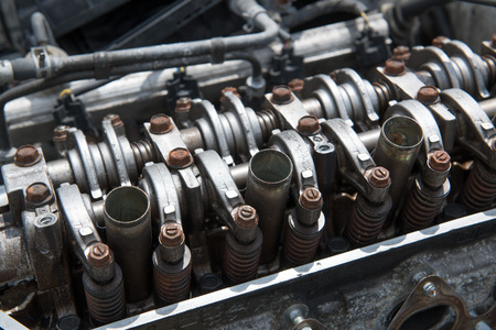 Car engine valves close up.Part of car's motor.Machinery detail of modern gasoline engine repair of cylinder head.Installing the valve of an overhauled engine.Mechanism automobile.Workshop motor car