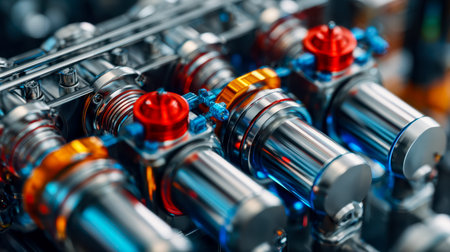 Intricate machinery featuring illuminated, multicolored connectors in a sleek, futuristic factory environment, showcasing innovation and precision eng