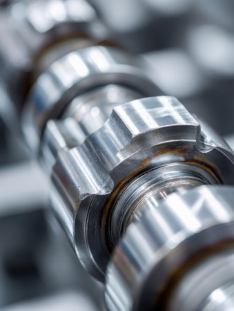 Close-up of a camshaft with polished lobes and precise machining details, resting on a sleek surface.