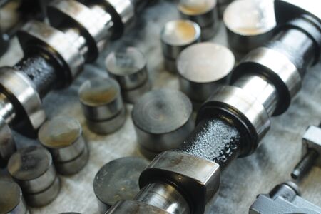 Camshaft and hydraulic compensators on the repair table. Close-up