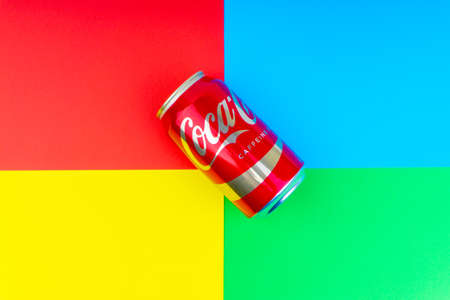 Kuala Lumpur, Malaysia - April 02,2020 : Coca - Cola carbonated soft drink on colorful background. Selective focus