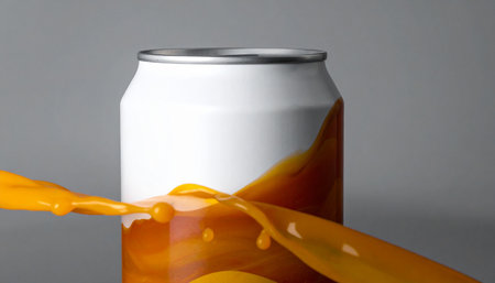 A white aluminum can is partially covered by a dynamic splash of bright orange liquid, creating an energetic visual.