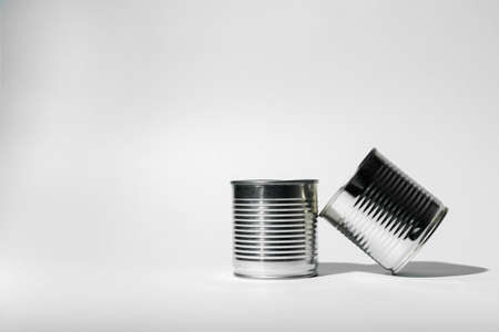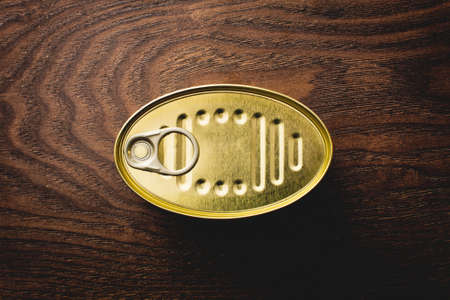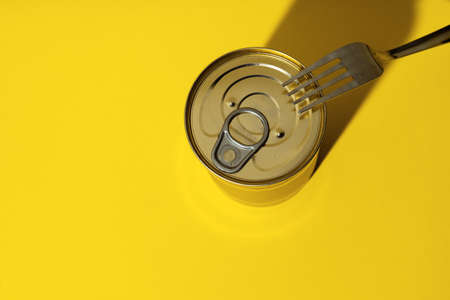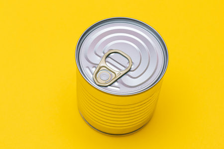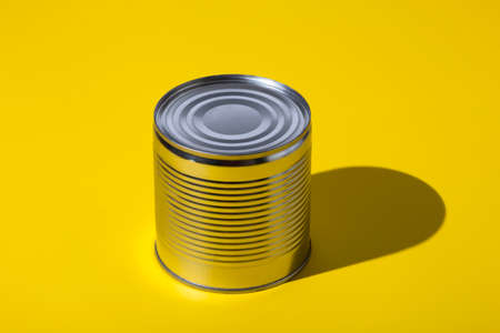 Unopened Tin Can with Blank Edge on Yellow Background. Canned Food. Aluminum Can for Safe and Long Term Storage of Food. Steel Sealed Food Storage Container