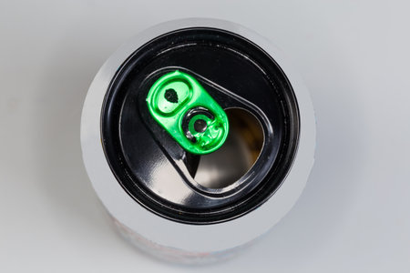 Used open empty aluminum beverage can with black top and green pull tab on a gray background, top view