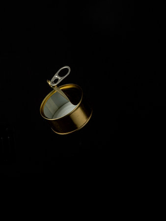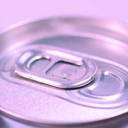 Open beverage can, used, shot against the light, with raised opening lip. Recycling of waste and aluminum. Recyclable material.