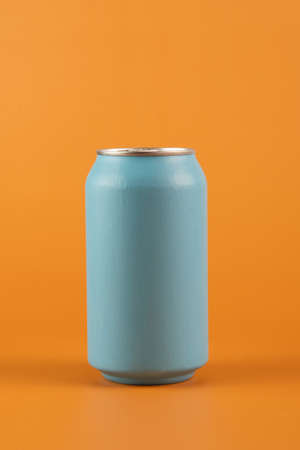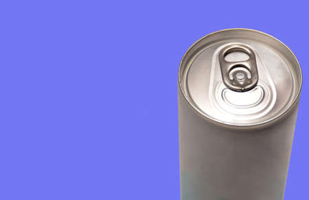 Thin aluminum can in silver, on a blue background, close-up, copy space