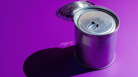 A sleek metallic canister lies on a vibrant purple surface, showcasing its open lid and reflecting the simplicity of modern design elements.