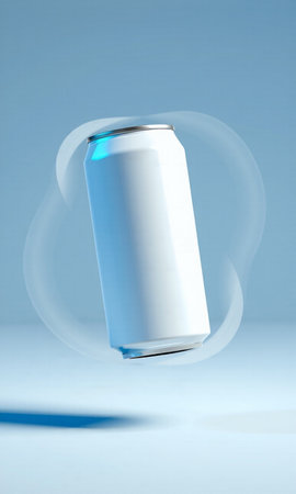 This digital artwork features a can of soda suspended in a soft, dreamy light blue background with ethereal, cloud-like forms. The composition is minimalist, emphasizing light and transparency.